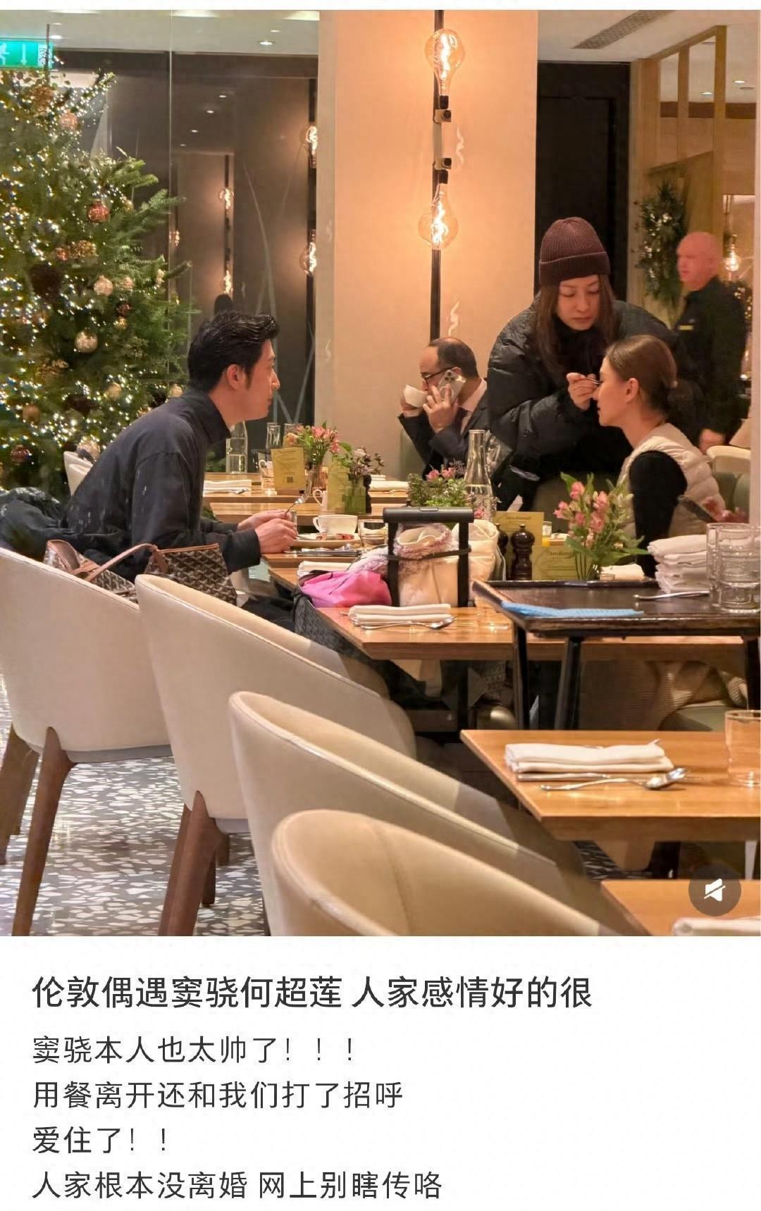 11月25日,有网友在英国某餐厅偶遇了窦骁何超莲。偶遇者称窦骁本人十分帅气,用餐离开后还和偶遇者打了招呼,偶遇者还强调窦骁何超莲根本没有离婚,呼吁大家不要瞎传。